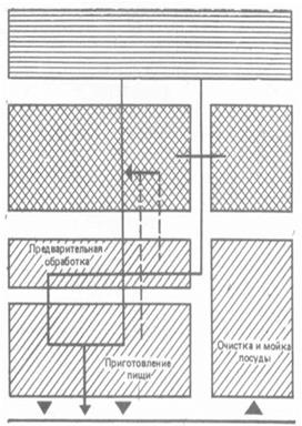Путь обратной транспортировки использованной посуды из торгового зала, который по возможности не должен пересекаться с путями движения посетителей, следует проектировать с учетом схемы входа и выхода потока посетителей. Пути транспортировки продуктов зависят от их ассортимента и степени обработки. Если продукты с низкой степенью обработки (овощи, свежее мясо) на пути от места приема до места раздачи должны еще быть подвергнуты всем частным технологическим процессам, продукты с высокой степенью обработки (кондитерские изделия, напитки) могут перемещаться, минуя один или даже несколько частных технологических процессов.