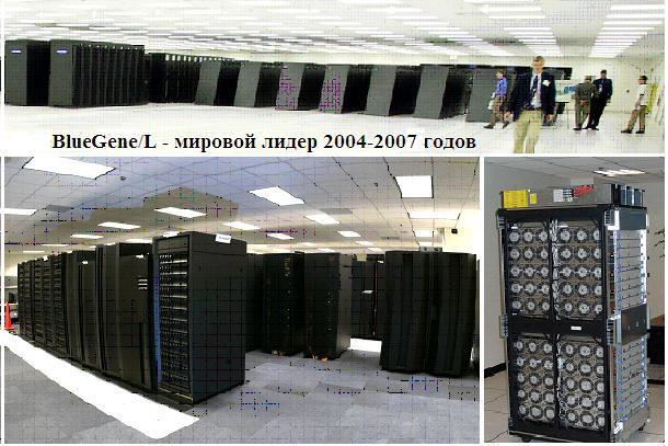 В табл. 1 приведены сведения о лидерах мирового списка Top500 наиболее производительных компьютеров мира. Этот список публикуется два раза в год, официальная страница Top500 находится по адресу http://www.top500.org/. Данные табл. 1 подтверждают рост производительности по показательному закону. В ноябрьских списках 2004-2007 годов первое место занимал суперкомпьютер BlueGene/L (рис. 1), включающий более 16 тысяч процессорных модулей (рис. 2), каждый из которых состоит из четырех двухпроцессорных СБИС.