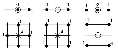 Примеры шаблонов для одномерных и двумерных задач приведены на рис. 1. На этом рисунке кружком большего диаметра обозначены узлы, в которых аппроксимируется производная. Черными точками обозначены узлы, значения фазовой переменной в которых входят в аппроксимирующее выражение. Число, записанное около узла, равно коэффициенту, с которым значение фазовой переменной входит в аппроксимирующее выражение. Так, для одномерных шаблонов в верхней части рисунка показана аппроксимация производной в точке , и указанным шаблонам при их просмотре слева направо соответствуют аппроксимации