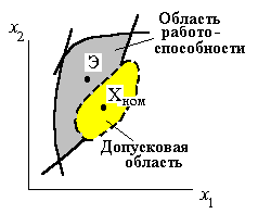 Содержательную сторону оптимизации с учетом допусков поясняет рис. 1, на котором представлены области работоспособности и допусковая в двумерном пространстве управляемых параметров. Если собственно допуски заданы и не относятся к управляемым параметрам, то цель оптимизации — максимальным образом совместить эти области так, чтобы вероятность выхода за пределы области работоспособности была минимальной.