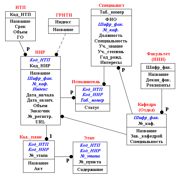 Поэтому в первоначальный вариант ИМ были введены сущности "НТП" — научно-техническая программа, "ГРНТИ" — Государственный реестр научно-технической информации, "НИР" — научно-исследовательская работа, "Специалист", "Кал. план" — календарный план, "Этап", "Факультет (НИИ)", "Кафедра (Отдел)". Затем были определены связи. Отношение между сущностями "НИР" и "Специалист" оказалось неспецифическим, оно было сведено к специфическому введением сущности-посредника "Исполнитель". В атрибуты сущностей-потомков вошли ключевые атрибуты сущностей-родителей. После составления списков атрибутов получилась IDEF1X-диаграмма, представленная на рис. 2, на которой внешние ключи выделены курсивом.