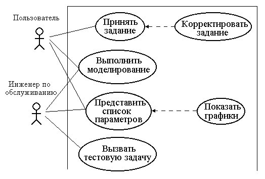 Разработка модели приложения с помощью языка UML начинается с построения диаграмм использования (use case diagram). Эти диаграммы характеризуют функциональность создаваемой системы с позиций пользователя и служат для отображения взаимодействия пользователей с проектируемой системой. В диаграммах в виде овалов представлены варианты использования, т.е. те функции, которые должна выполнять система (рис. 1). Пользователи изображаются в виде стилизованных фигурок, ими могут быть не только люди, но и любые внешние образования, пользующиеся услугами проектируемой системы. Благодаря диаграммам использования, определяется и согласовывается внешняя функциональность системы и в итоге формируется техническое задание на разработку этой системы