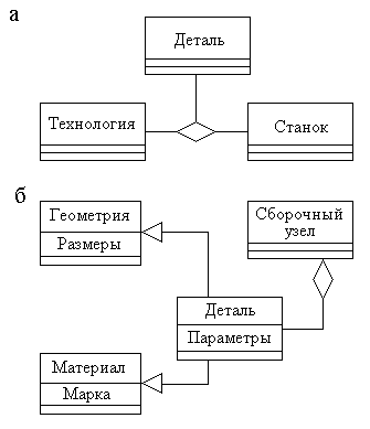 Рис. 3. Отношения тернарной ассоциации (а), агрегирования и наследования (б) в диаграммах классов
