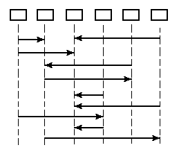 В диаграммах последовательностей (sequence diagram), называемых также диаграммами сценариев, отражается последовательность событий, заключающихся в воздействиях одного объекта на некоторый другой объект. В этих диаграммах объекты изображаются прямоугольниками и располагаются каждый в своей вертикальной колонке диаграммы. Ось времени направлена вертикально вниз. От каждого объекта параллельно оси времени идут так называемые их линии жизни. Каждое событие изображается горизонтальной линией со стрелкой от линии жизни объекта, посылающего сообщение, к линии жизни объекта, принимающего сообщение. Над этими линиями возможен поясняющий текст. Линии располагаются одна над другой в порядке, в котором события совершаются. Пример диаграммы сценариев дан на рис. 4, где прямоугольники объектов расположены в верхней части своих колонок.
