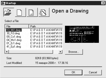 Open a Drawing — для открытия ранее созданного чертежа. Позволяет выбрать из списка один из рисунков, открывавшихся последними, и загрузить его в AutoCAD. Чтобы загрузить файл, отсутствующий в списке, следует нажать кнопку обзора Browse...;