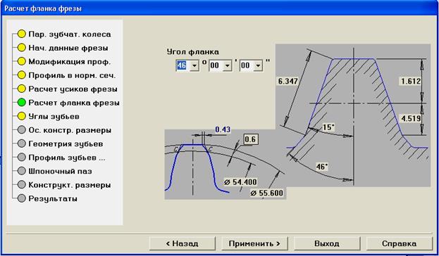 16. В окне Расчет фланка фрезы измените угол фланка с 30° на 46°.