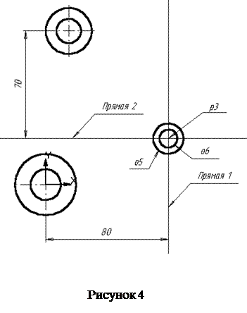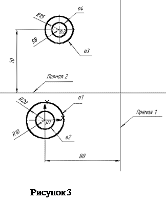 7. За допомогою цієї ж команди будується пряма 2, паралельно горизонтальній осі симетрії кола о3 на відстані 70 мм униз (рисунок 3).