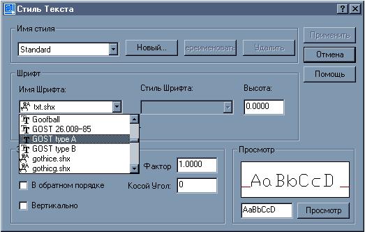 Имя стиля сохраняем Standard. Из имен шрифтов выбираем с помощью прокрутки Gost type A.shx. В окне Угол наклона набираем с клавиатуры величину угла 15° от нормали к основанию текста по часовой стрелке. В окне Высота устанавливаем высоту шрифта 0. Это значит, что при написании какого-либо текста система будет запрашивать требуемую высоту текста. Назначаем степень растяжения знаков 0,8. Завершаем выбор нажатием на кнопку Применить или Закрыть.