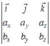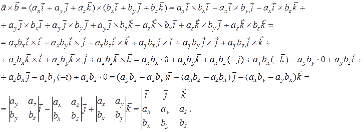 Таким образом, векторное произведение можно вычислить как разложение по элементам первой строки определителя, первая строка которого орты координатных осей, а вторая и третья составлены из координат перемножаемых векторов.