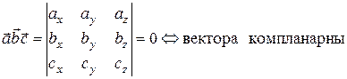 компланарны тогда и только тогда, когда их смешанное произведение равно 0, т.е.