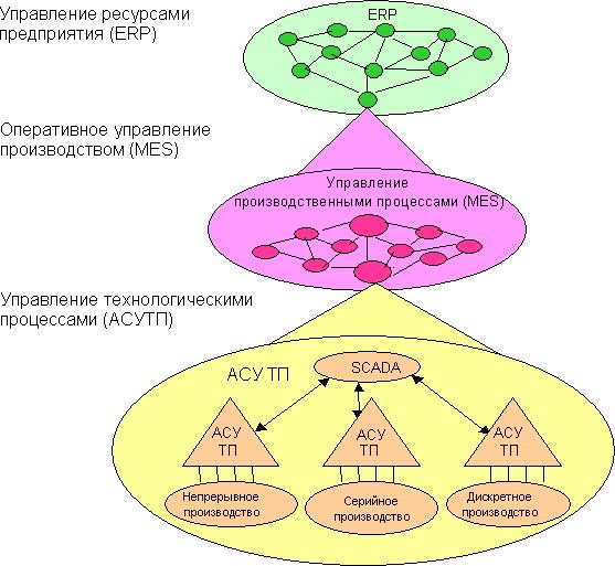 · контур управления уровня АСУТП (технологический) является самым интенсивным по объему информации и самым жестким по времени реакции, которое может составлять секунды и даже миллисекунды. В верхнем уровне слоя АСУТП - в SCADA-системах происходит накопление и обработка большого числа технологических параметров и создается информационная база исходных данных для MES-уровняю.