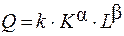 где Q – максимальный объем выпуска продукта при заданных факторах производства; K, L – соответственно, затраты капитала и труда; k – коэффициент, отражающих уровень технологии данного производства (чем выше технологии, тем выше k); α, β – показатели эластичности объема производства, соответственно, по капиталу и труду; α – отражает приращение Q на 1 % увеличения K при L –постоянном(эластичность выпуска по затратам капитала); β – изменение Q на 1 % увеличения L при постоянном K (эластичность выпуска по труду).