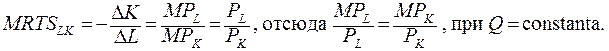 Учитывая, что в точке Е (рис. 5.9) изокванта и изокоста имеют одинаковый угол наклона и что наклон изокванты измеряется предельной нормой технологического замещения, можно записать условие равновесия следующим образом: