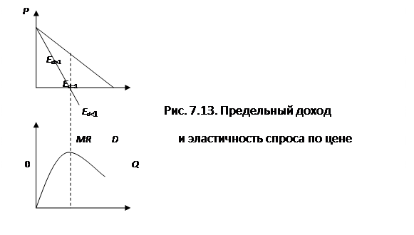 Предельный доход непосредственно зависит от эластичности спроса. Когда спрос эластичен, увеличение выпуска повышает совокупный доход и предельный доход положителен. При неэластичном спросе увеличение объемов выпуска сокращает совокупную выручку, и предельный доход отрицательный. В случае единичной эластичности по цене, увеличение величины спроса полностью компенсируется снижением цены. Совокупная выручка при этом не меняет своей величины, а предельный доход равен нулю. Эта зависимость представлена на рис. 7.13 и рис. 7.14.