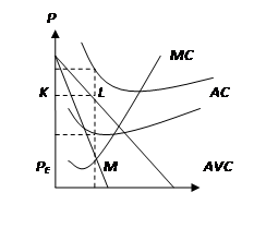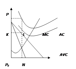 При равновесном объеме производства (QE) равновесная цена ниже средних издержек (PE<AC), но превышает средние переменные издержки (PE >AVC), фирма получает операционную прибыль и тем самым минимизирует свои убытки. Кривая AC проходит выше кривой спроса, а кривая AVC – частично выше кривой спроса. Вертикальный отрезок MN отражает операционную прибыль, а прямоугольник PEMNS – общую прибыль от производства. Верхний прямоугольник KLMPE соответствует величине экономических убытков и равен части постоянных издержек, которые не могут быть покрыты столь низкой ценой PE.
