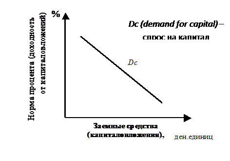 В целом спрос на капитал имеет тенденцию к понижению, так как по мере роста инвестируемых средств и объемов производства снижаются темпы роста предельного продукта капитала. Эта тенденция спроса объясняется законом убывающей доходности (предельной производительности или отдачи) и известна бизнесу: при прочих равных условиях (т.е. неизменных объемах используемых факторов труда и земли) уровень дохода на капитал (предельный продукт, доходность) имеет тенденцию к понижению по мере роста вовлеченного в производство капитала. Объясняется это тем, что по мере увеличения вложений одного ресурса (капитала) на его долю приходится всё меньше и меньше количества фиксированных ресурсов (труда и земли), вследствие чего производительность капитала (предельный продукт, доход) падает. Кривая спроса на капитал в виде заемных средств представлена на рис. 9.3.