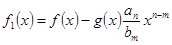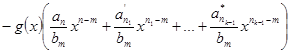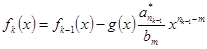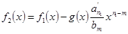 2. Пусть n≥m. В этом случае составим вспомогательный многочлен степени n1. Если n1≤m, то ограничиваемся одним этим многочленом, если же n1≥m, то строим (где – старший коэффициент многочлена f1(x)). Если степень n2 многочлена f2(x) меньше m, то ограничиваемся построенными двумя многочленами, если же n2≥m, то продолжаем (аналогично предыдущему) строить вспомогательные многочлены f3(x), f4(x), …, fs(x), …. При этом степень каждого следующего многочлена меньше степени предыдущего, поэтому на определённом k-м шаге имеем многочлен , степень которого меньше m (или fk(x)=0).