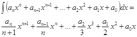 По аналогии с аналитической производной для полинома можно определить аналитический интеграл. Первообразная степенной функции –степенная же функция степени на единицу выше, поэтому интеграл от полинома также будет полиномом: