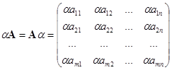 Произведением матрицы A на число α (или произведением числа α на матрицу А) называется матрица, элементы которая получены умножением всех элементов матрицы А на число α, т. е.