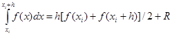 Метод трапеций получается при замене подынтегральной функции полиномом первой степени P1(x), для чего приходится использовать обе границы частичного интервала. На каждом элементарном отрезке аргумента х участок кривой интегрирования представляет собой отрезок прямой – две ординаты и отрезок оси абсцисс вместе с этой прямой ограничивают фигуру трапецеидальной формы, что и дает название этому методу кусочно-линейной аппроксимации подынтегральной функции. Приближенное значение интеграла определяется площадью трапеции: