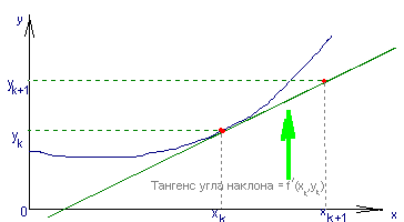 Геометрический смысл последнего выражения в аппроксимации решения на отрезке [tk, tk+1] отрезком касательной к графику решения в точке tk.