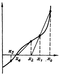 Метод секущих– модификация метода Ньютона, связанная с заменой производной функции отношением приращения функции к приращению аргумента. Для старта процесса уточнения необходимо задать два близких друг к другу приближения x0 и x1, а каждое новое приближение получим по формуле: