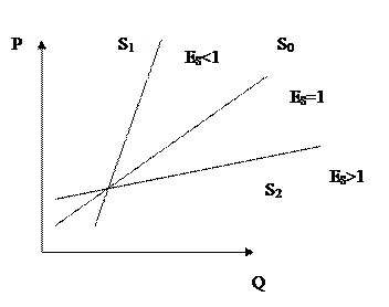 На рис. 11. Представлен графики эластичности предложения по цене. Кривая S1 является неэластичной, кривая S0 имеет единичную эластичность, а кривая S2 представляет эластичное предложение.