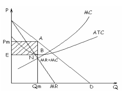 6) из точки В проводится линия, параллельная линии А - Pm. Образовавшийся четырехугольник (он заштрихован) и является прибылью монопольной фирмы.