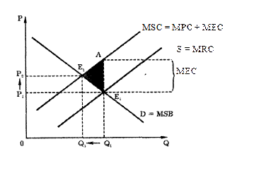 Между тем предельные социальные издержки равны сумме предельных частных издержек плюс предельные внешние издержки. Следовательно, если бы удалось превратить внешние издержки во внутренние, эффективный объем выпуска сократился бы до Q2 при росте цены до Р2. В точке Е2 предельные общественные выгоды равнялись бы предельным общественным издержкам MSB = MSC.