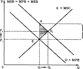 В случае с обучением корректирующая субсидия, равная предельным внешним выгодам (S = МЕВ), могла быть предоставлена студентам, что повысило бы их спрос на услуги образовательных учреждений до уровня, при котором MSB = MSC.