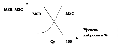 Пересечение кривой предельных общественных выгод MSB с кривой предельных общественных издержек MSC позволяет определить эффективный для данного общества уровень вредных выбросов (рис. 59). Дело в том, что по мере снижения процента загрязняющих окружающую среду выбросов предельные социальные затраты резко возрастают, поэтому каждый дополнительный процент снижения обходится все дороже и дороже.