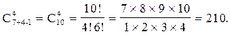 10.25 Пример. В кондитерской имеется 7 видов пирожных. Покупатель берет 4 пирожных. Сколькими способами он может это сделать ? (Предполагается, что пирожных каждого вида ³ 4).