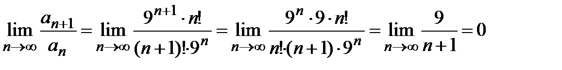 Решение. Данный ряд является знакопеременным, общий член которого обозначим: . Составим ряд из абсолютных величин и применим к нему признак Даламбера. Составим предел , где , . Проведя преобразования, получаем . Таким образом, ряд сходится, а значит, исходный знакопеременный ряд сходится абсолютно. Ответ: ряд абсолютно сходится.