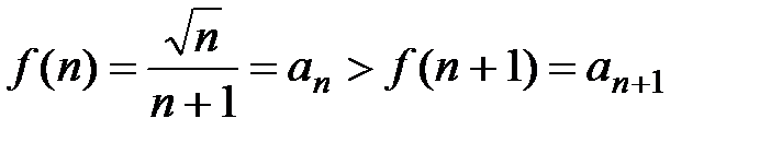 Б) Далее исследуем исходный ряд на условную сходимость. Для этого проверим выполнение условий признака Лейбница (теорема 1, разд. 3.1). Условие 1): , где , т.е. этот ряд знакочередующийся. Для проверки условия 2) о монотонном убывании членов ряда используем следующий метод. Рассмотрим вспомогательную функцию , определенную при (функция такова, что при имеем ). Для исследования этой функции на монотонность найдём её производную: . Эта производная при . Следовательно, функция монотонно убывает при указанных значениях х. Полагая , получаем , где . Это означает, чтоусловие 2) выполнено. Для проверки условия 3) находим предел общего члена : , т.е. третье условие выполняется. Таким образом, для исходного ряда выполнены все условия признака Лейбница, т.е. он сходится.