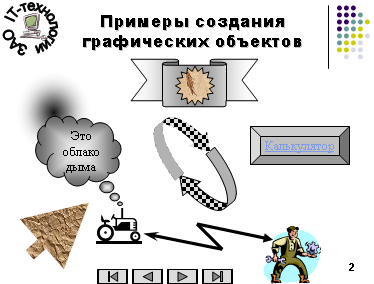 При создании второго слайда для создания графических объектов используйте панель инструментов Рисование.