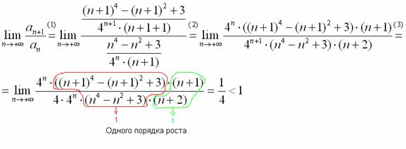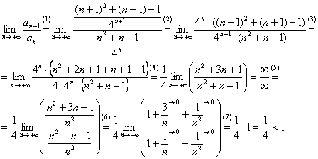 (1) Составляем отношение следующего члена ряда к предыдущему: . Из условия мы видим, что общий член ряда . Для того, чтобы получить следующий член ряда необходимо вместо подставить : . (2) Избавляемся от четырехэтажности дроби. При определенном опыте решения этот шаг можно пропускать. (3) В числителе раскрываем скобки. В знаменателе выносим четверку из степени. (4) Сокращаем на . Константу выносим за знак предела. В числителе в скобках приводим подобные слагаемые. (5) Неопределенность устраняется стандартным способом – делением числителя и знаменателя на «эн» в старшей степени. (6) Почленно делим числители на знаменатели, и указываем слагаемые, которые стремятся к нулю. (7) Упрощаем ответ и делаем пометку, что с выводом о том, что, по признаку Даламбера исследуемый ряд сходится.