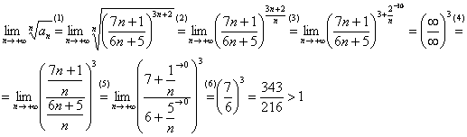 (1) Оформляем общий член ряда под корень. (2) Переписываем то же самое, только уже без корня, используя свойство степеней . (3) В показателе почленно делим числитель на знаменатель, указывая, что (4) В результате у нас получилась неопределенность . Здесь можно было пойти длинным путем: возвести в куб, возвести в куб, потом разделить числитель и знаменатель на «эн» в старшей степени. Но в данном случае есть более эффективное решение: можно почленно поделить числитель и знаменатель прямо под степенью-константой. Для устранения неопределенности делим числитель и знаменатель на (старшую степень). (5) Собственно выполняем почленное деление, и указываем слагаемые, которые стремятся к нулю. (6) Доводим ответ до ума, помечаем, что и делаем вывод о том, что ряд расходится.