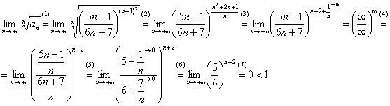 (1) Помещаем общий член ряда под корень. (2) Переписываем то же самое, но уже без корня, при этом раскрываем скобки, используя формулу сокращенного умножения: . (3) В показателе почленно делим числитель на знаменатель и указываем, что . (4) Получена неопределенность вида . Здесь можно прямо в скобке почленно поделить числитель на знаменатель на «эн» в старшей степени. Нечто подобное у нас встречалось при изучении второго замечательного предела. Но здесь ситуация другая. Если бы коэффициенты при старших степенях были одинаковыми, например: , то фокус с почленным делением уже бы не прошел, и надо было бы использовать второй замечательный предел. Но у нас эти коэффициенты разные (5 и 6), поэтому можно (и нужно) делить почленно (кстати, наоборот – второй замечательный предел при разных коэффициентах при старших степенях уже не прокатывает). (5) Собственно выполняем почленное деление и указываем, какие слагаемые у нас стремятся к нулю. (6) Неопределенность устранена, остался простейший предел: .Почему в бесконечно большой степени стремится к нулю? Потому что основание степени удовлетворяет неравенству . Если у кого есть сомнения в справедливости предела , то я не поленюсь, возьму в руки калькулятор: Если , то Если , то Если , то Если , то Если , то … и т.д. до бесконечности – то есть, в пределе: (7) Указываем, что и делаем вывод о том, что ряд сходится.