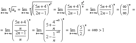 Мы видим, что общий член ряда полностью находится под степенью, зависящей от , а значит, нужно использовать радикальный признак Коши: Таким образом, исследуемый ряд расходится.