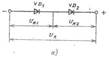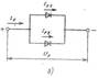 При последовательном и параллельном соединениях диодов из-за несовпадения их ВАХ возникают неравномерные распределения напряжений или токов между отдельными диодами. На рис. 1.3 представлены схемы: последовательного (рис. 1.3, а) и параллельного (рис; 1.3, 6) соединения двух диодов. Там же представлены прямые (рис. 1.3, г) и обратные (рис. 1.3, в) ветви ВАХ соединяемых диодов. Согласно приведенным ВАХ при последовательном соединении диодов, приложенное к ним обратное напряжение UR при одинаковых обратных токах IR распределяется между диодами неравномерно: к диоду VD1 прикладывается напряжение UR1, а к диоду VD2 — напряжение UR2 (рис. 1-3,в). При параллельном соединении диодов протекающий через них общий ток IF при одинаковых прямых падениях напряжения UF распределяется также неравномерно: через диод VD1 протекает ток IF1, а чёрtp диод VD2 ток IF2 (рис. 1.3,г). Для исключения выхода из строя диодов из-за перегрузки по току или перенапряжений принимают специальные меры по выравниванию указанных параметров между отдельными диодами. При последовательном соединении диодов для выравнивания напряжений обычно используются резисторы, включенные параллельно диодам, а при параллельном соединении — индуктивные делители различных типов.