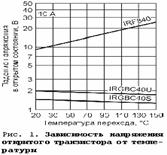Кроме того, падение напряжения на открытом транзисторе зависит от температуры, причем зависимость эта - положительная для MOSFET и отрицательная для IGBT. На графике рис. 1 приведена зависимость напряжения открытого транзистора для двух IGBT-транзисторов с разным быстродействием и MOSFET-транзистора, имеющего аналогичный размер кристалла . Ввиду большей стойкости MOSFET к лавинному пробою, 500-вольтовый полевой транзистор сравнивается с IGBT, рассчитанным на напряжение 600 В.