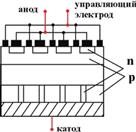 Запираемый тиристор - полностью управляемый полупроводниковый прибор, в основе которого классическая четырёхслойная структура. Включают и выключают его подачей положительного и отрицательного импульсов тока на электрод управления. На Рис. 1 приведены структурная схема (б) выключаемого тиристора. Подобно обычному тиристору он имеет катод K, анод А, управляющий электрод G. Различия в структурах приборов заключается в ином расположении горизонтальных и вертикальных слоёв с n- и р-проводимостями.