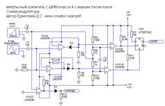 Этот усилитель создан на основе импульсного усилителя класса А. Суть в том, что длительность импульса положительного и отрицательного должна регулироваться так же как в импульсном усилителе с двумя ШИМ, но при нулевом входном сигнале должен оставаться небольшой ток покоя через нагрузку. Другими словами ШИП обоих плеч не должен полностью закрываться. Для того, чтобы малые сигналы звучали без искажений, переход напряжения от минуса к плюсу в районе нулевого времени должен производить один ШИМ. Тогда, упростив все устройство, я получаю, что переход через ноль времени должен осуществляться блоком питания - тогда эта функция будет реализована сразу для всех каналов усилителя. Продолжительности правого и левого (положительного и отрицательного) импульса регулирует один ШИМ - что соответствует импульсному усилителю класса А. Значит и усиление малых сигналов будет происходить линейно, вне зависимости от скорости нарастания или спада тока при коммутации выходных транзисторов.