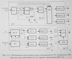 Согласно четвертому признаку классификации, различают СУВ с горизонтальным и вертикальным управлением. Горизонтальным называется способ управления, при котором фазовый сдвиг синхронизирующего синусоидального сигнала по отношению к напряжению питающей сети на угол (3 осуществляется с помощью RC или RL цепи, т.е. смещается по горизонтали. Полученное таким образом сдвинутое по фазе синусоидальное напряжение используется далее для формирования управляющего импульса тиристорами ВПУ. Схемы с горизонтальным управлением имеют ограниченное быстродействие и не нашли широкого применения. Вертикальный принцип управления и структурные схемы построения ФСУ,