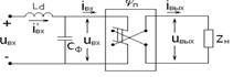 Как видно из второго уравнения, входной ток инвертора будет импульсным (со скачком тока), что не допускает присутствия во входном источнике индуктивности. Реальные источники входного напряжения (чаще всего выпрямители), как правило, обладают индуктивностью L (если это только не аккумуляторы). Для устранения ее влияния на входе инвертора напряжения включается фильтровый конденсатор Cф достаточной емкости, что является