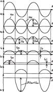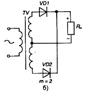 Рис. 2 Однофазная двухполупериодная схема выпрямления со средней точкой (а) и диаграмма напряжений и токов на элементах схемы (б)