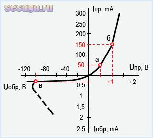 Например. При прямом напряжении Uпр = 0,5В прямой ток Iпр равен 50mA (точка «а» на графике), а уже при напряжении Uпр = 1В ток возрастает до 150mA (точка «б» на графике).