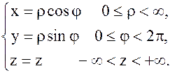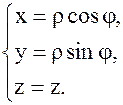 Пример 1.В цилиндрических координатах положение точки M(x,y,z) пространства определяется тремя координатами , где ρ – расстояние от проекции точки M на плоскость X0Y точки N до начала координат, φ – угол между положительным направлением оси 0X и вектором . Третьи координаты точки М в цилиндрической и декартовой системе координат совпадают.