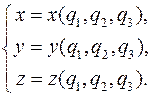Так как любой точке M можно поставить в соответствие ее декартовы (x, y, z) и криволинейные координаты, то это означает, что между переменными x, y, z и существует функциональная зависимость