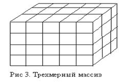 (3 слоя по 4 строки по 5 элементов в строке). Такой массив можно представить в виде параллелепипеда (рис 3.). Предположим, что элементы массива следуют в памяти в лексикографическом порядке, то есть так, что первым изменяется последний индекс. Такой порядок используется в большинстве алгоритмических языков, но есть и исключения, например, Фортран. Порядковый номер элемента массива A[i][j][k] можно вычислить по формуле:
